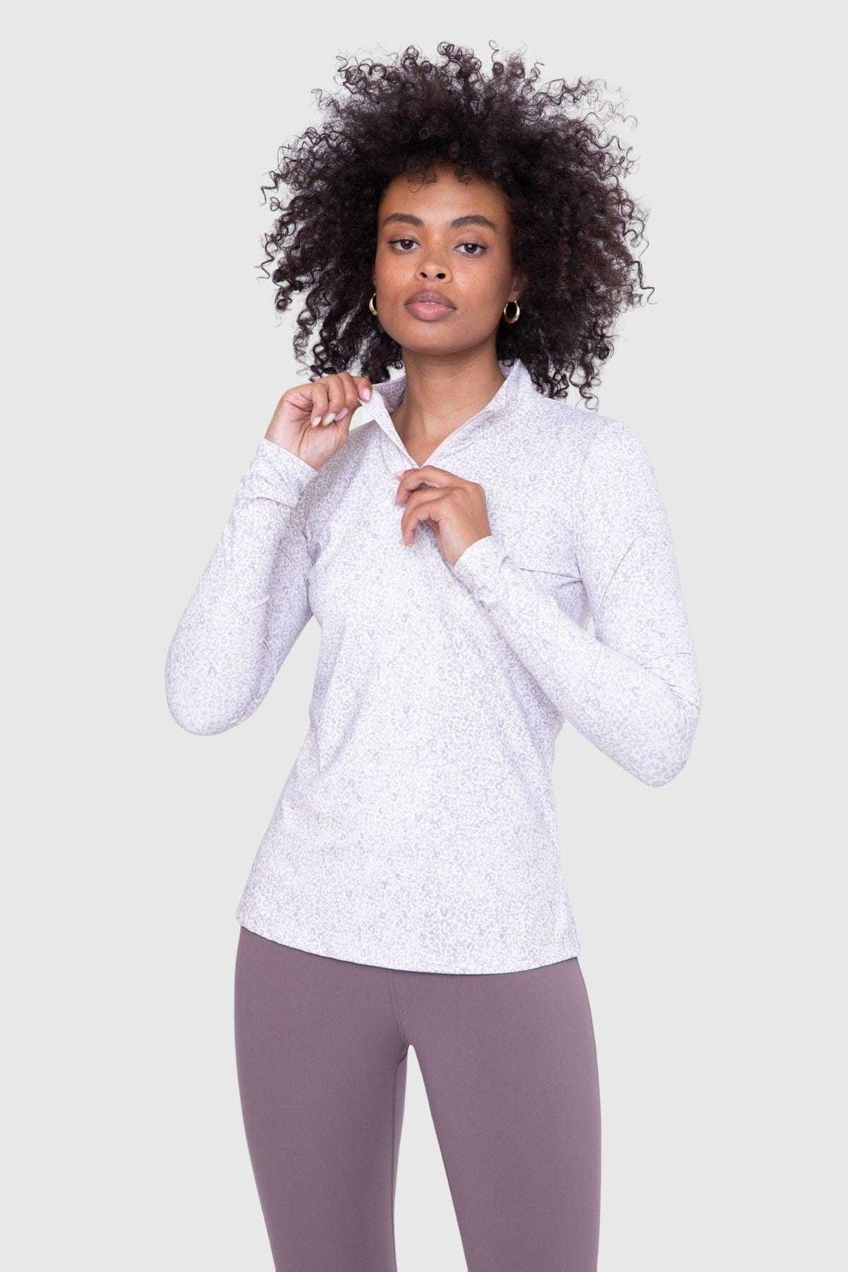 This leopard print active pullover is great piece to add into your fitness wardrobe. Featuring a half zip neck closure with chin guard and split side hem.